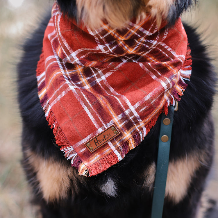 Snap On Bandana - Cotton flannel fabric, a coordinating solid backing and a durable Hoot + Co logo metal snap. Each bandana is hand cut and sewn to fit your animal precisely. Our bandanas feature a curved neck for a comfortable fit that won’t bunch up. All of our bandanas are reversible! Just simply snap them on the other way and you have a solid bandana also, perfect for adding your favorite patch to!