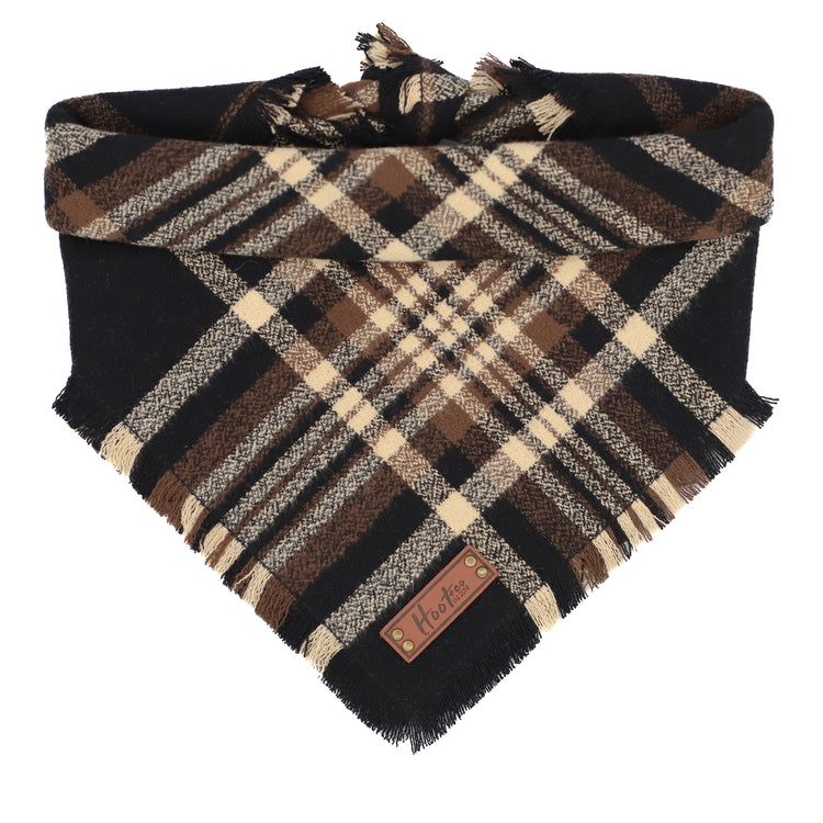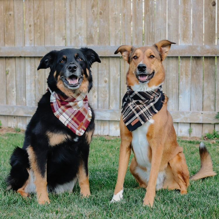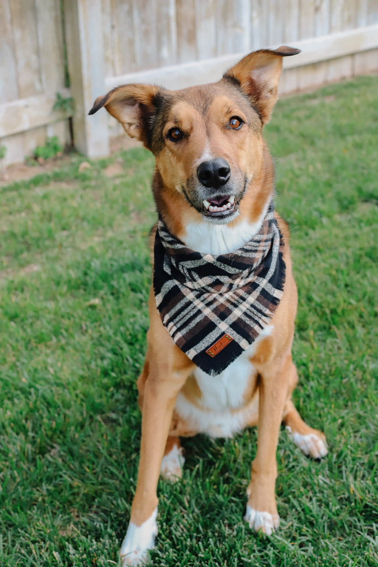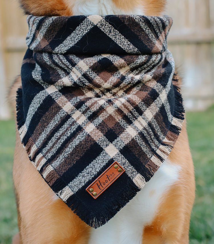 Snap On Bandana - Cotton flannel fabric, a coordinating solid backing and a durable Hoot + Co logo metal snap. Each bandana is hand cut and sewn to fit your animal precisely. Our bandanas feature a curved neck for a comfortable fit that won’t bunch up. All of our bandanas are reversible! Just simply snap them on the other way and you have a solid bandana also, perfect for adding your favorite patch to!