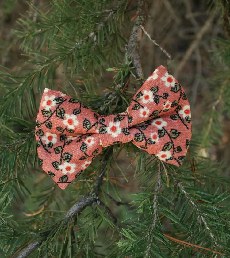 Our pet bow ties are made with high quality fabric and a built in stabilizer to prevent from becoming squished over wear. Each one has a velcro loop that wraps snugly on your pets collar. Each bow tie has a coordinating color in the inside to match. Each bow tie may have a different pattern, depending on how it's cut.