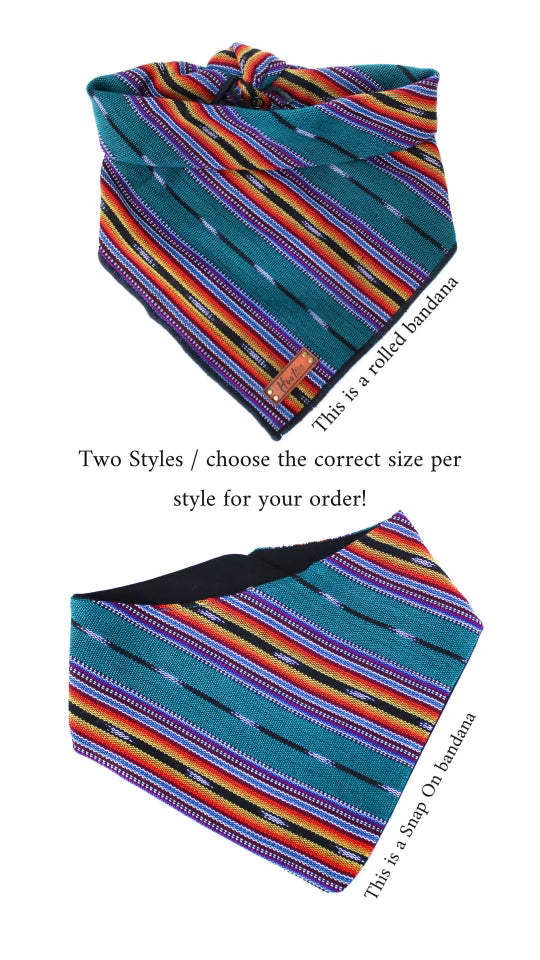 Rolled Bandana - Each bandana features a faux leather tag, rolled edges, and an added snap for durability. Simply roll + tie the bandana to fit your pup. This style has more sizing adjustability than a snap on.