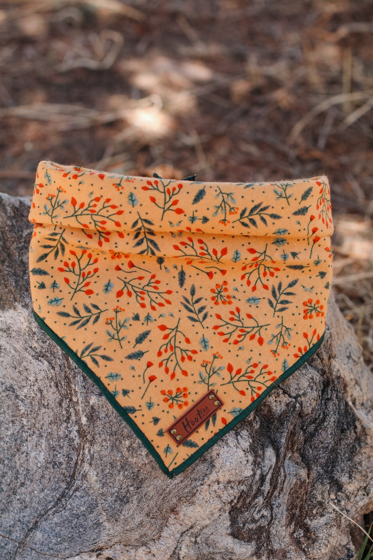 Snap On Bandana - Cotton fabric, a coordinating solid backing and a durable Hoot + Co logo metal snap. Each bandana is hand cut and sewn to fit your animal precisely. Our bandanas feature a curved neck for a comfortable fit that won’t bunch up. All of our bandanas are reversible! Just simply snap them on the other way and you have a solid bandana also, perfect for adding your favorite patch to!