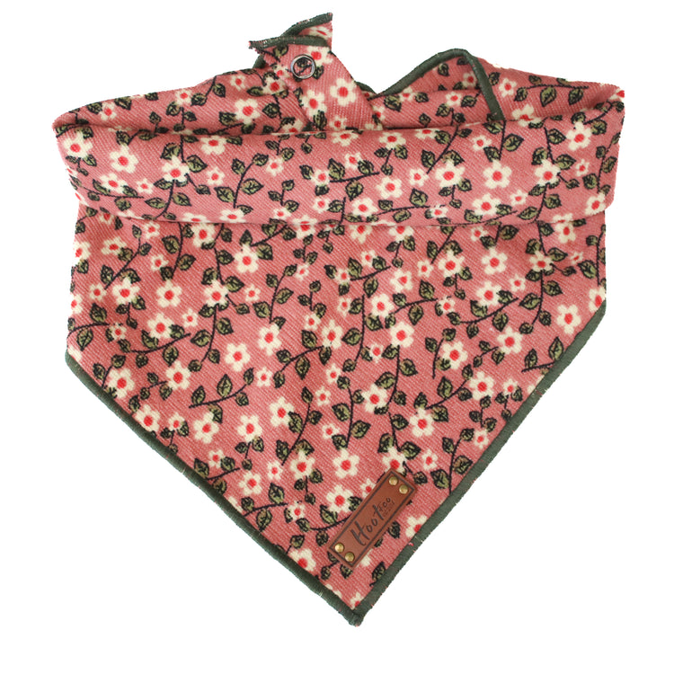 Snap On Bandana - Cotton fabric, a coordinating solid backing and a durable Hoot + Co logo metal snap. Each bandana is hand cut and sewn to fit your animal precisely. Our bandanas feature a curved neck for a comfortable fit that won’t bunch up. All of our bandanas are reversible! Just simply snap them on the other way and you have a solid bandana also, perfect for adding your favorite patch to!