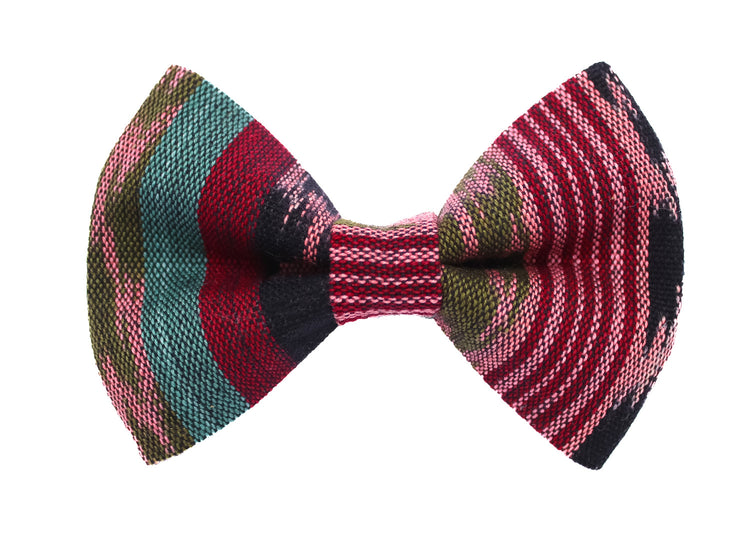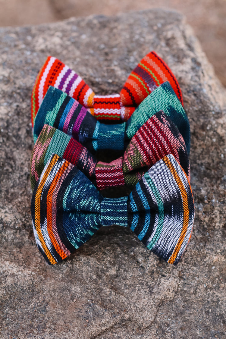 Our pet bow ties are made with high quality fabric and a built in stabilizer to prevent from becoming squished over wear. Each one has an elastic loop that slip on your pets collar. Each bow tie has a coordinating color in the inside to match. Each bow tie may have a different pattern, depending on how it's cut.