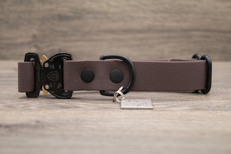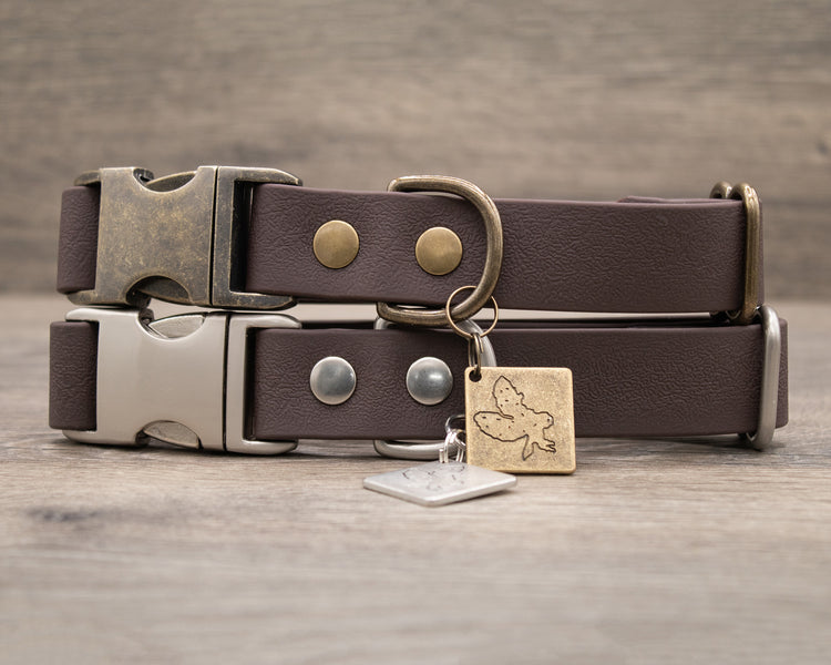 Your new favorite adventure collar! All of our collars are made with a custom coated webbing and our very own colors! Although they may look similar to leather, they are made with a durable coated webbing that can withstand the elements. They are waterproof, mold resistant, and low maintenance! We use zinc alloy coated buckles and solid brass hardware, both of which are resistant to rust. Brass hardware can patina with use when exposed to water + sun and may rub onto lighter coated coats.