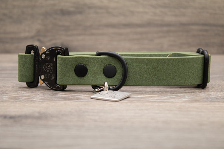 Your new favorite adventure collar! All of our collars are made with a custom coated webbing and our very own colors! Although they may look similar to leather, they are made with a durable coated webbing that can withstand the elements. They are waterproof, mold resistant, and low maintenance! We use zinc alloy coated buckles and solid brass hardware, both of which are resistant to rust. Brass hardware can patina with use when exposed to water + sun and may rub onto lighter coated coats.
