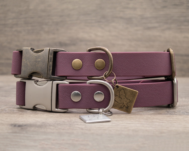 Your new favorite adventure collar! All of our collars are made with a custom coated webbing and our very own colors! Although they may look similar to leather, they are made with a durable coated webbing that can withstand the elements. They are waterproof, mold resistant, and low maintenance! We use zinc alloy coated buckles and solid brass hardware, both of which are resistant to rust. Brass hardware can patina with use when exposed to water + sun and may rub onto lighter coated coats.