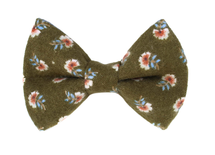 Our pet bow ties are made with high quality fabric and a built in stabilizer to prevent from becoming squished over wear. Each one has a velcro loop that wraps around your pets collar. Each bow tie has a coordinating color in the inside to match. Each bow tie may have a different pattern, depending on how it's cut.