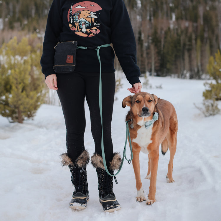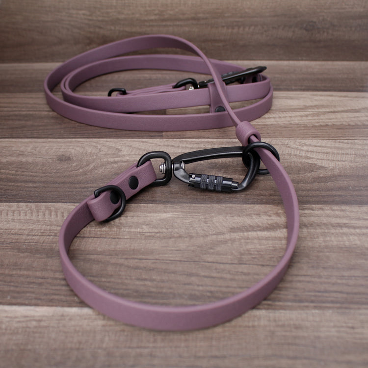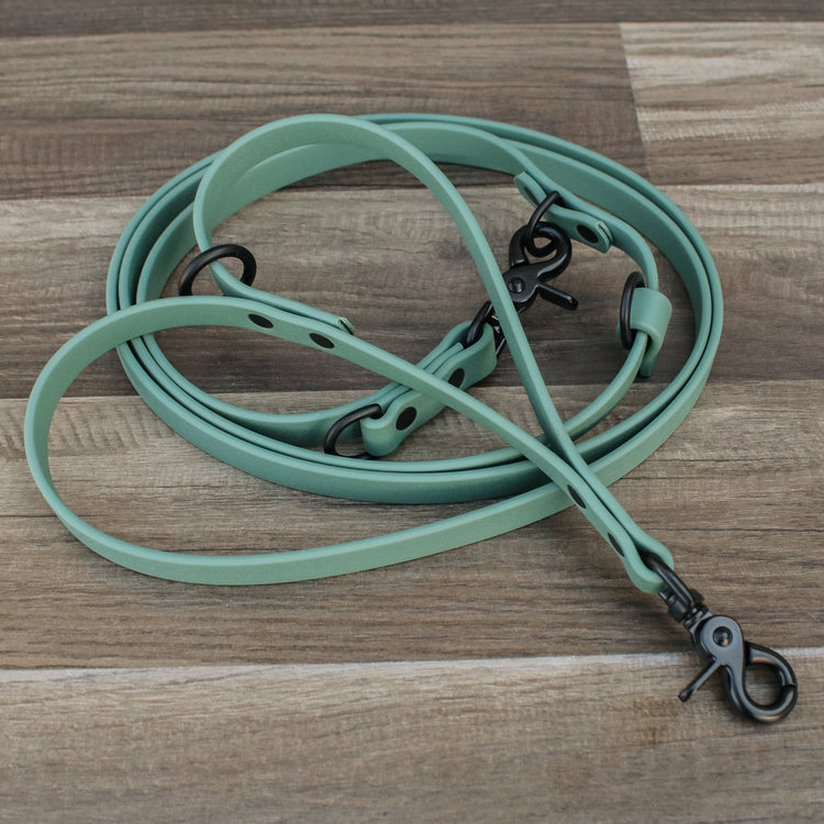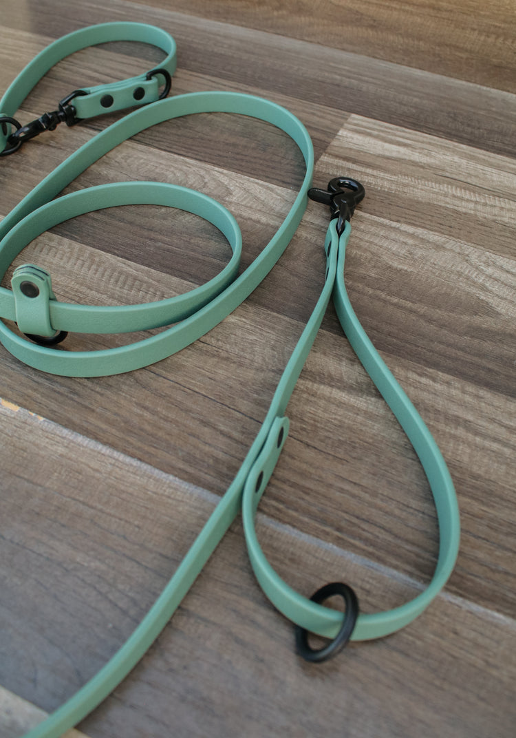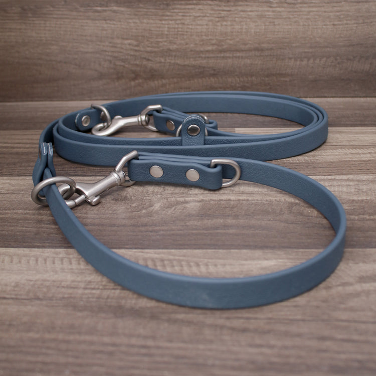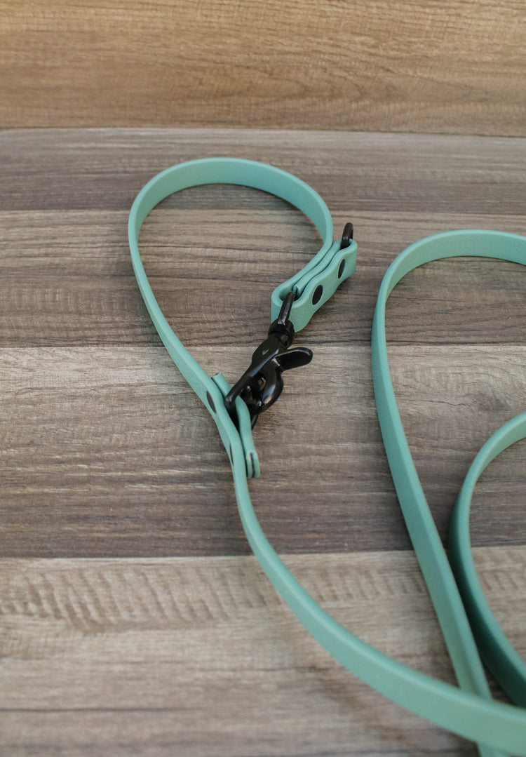 All of our leashes are made with HydraFlex - a custom coated webbing and handpicked colors! Although they may look similar to leather, they are made with a durable coated webbing that can withstand the elements. They are waterproof, mold resistant, and low maintenance! We use solid brass hardware which is resistant to rust, however brass may patina when exposed to sun + water.