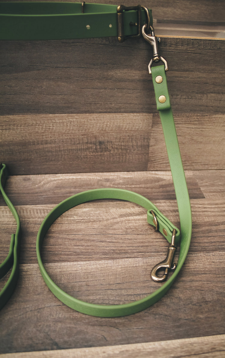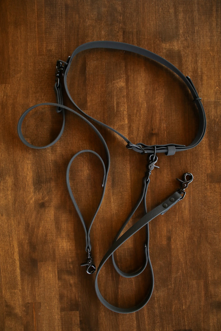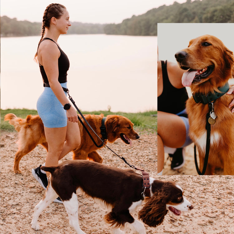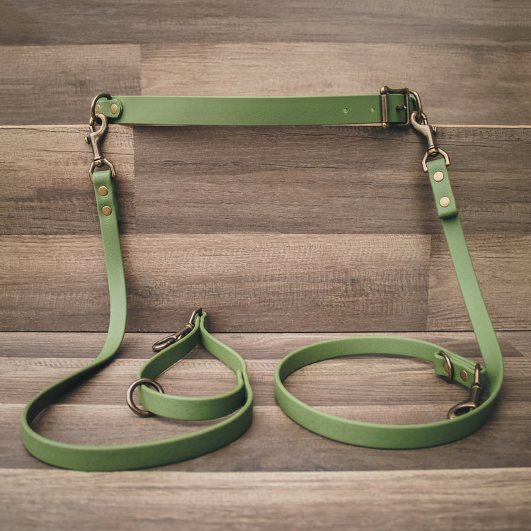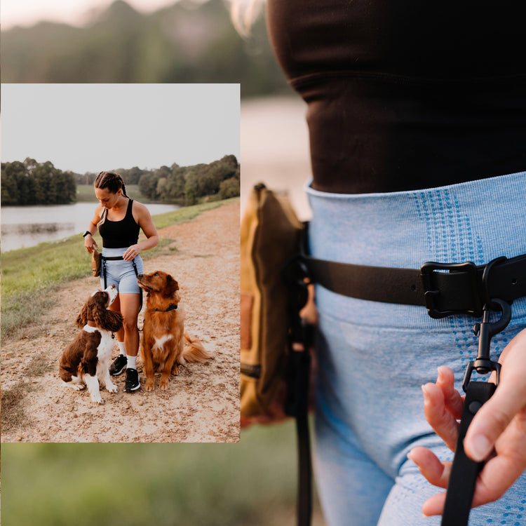The hands free belt + leash system you've been waiting for! Choose up to 3 clip in points and 3 different leash designs (standard, traffic handle, slip). Every leash has a double end clip - one to the dog, one to the belt with no handle. However, every leash has an included d-ring or o-ring that allows you to clip one end to it which creates a small leash/traffic handle (18-24"). Dogs can be quickly unclipped at the collar to let off leash and clip the end back onto the leash until needed again! Dogs can also be unclipped directly from the belt rather quickly if needed.