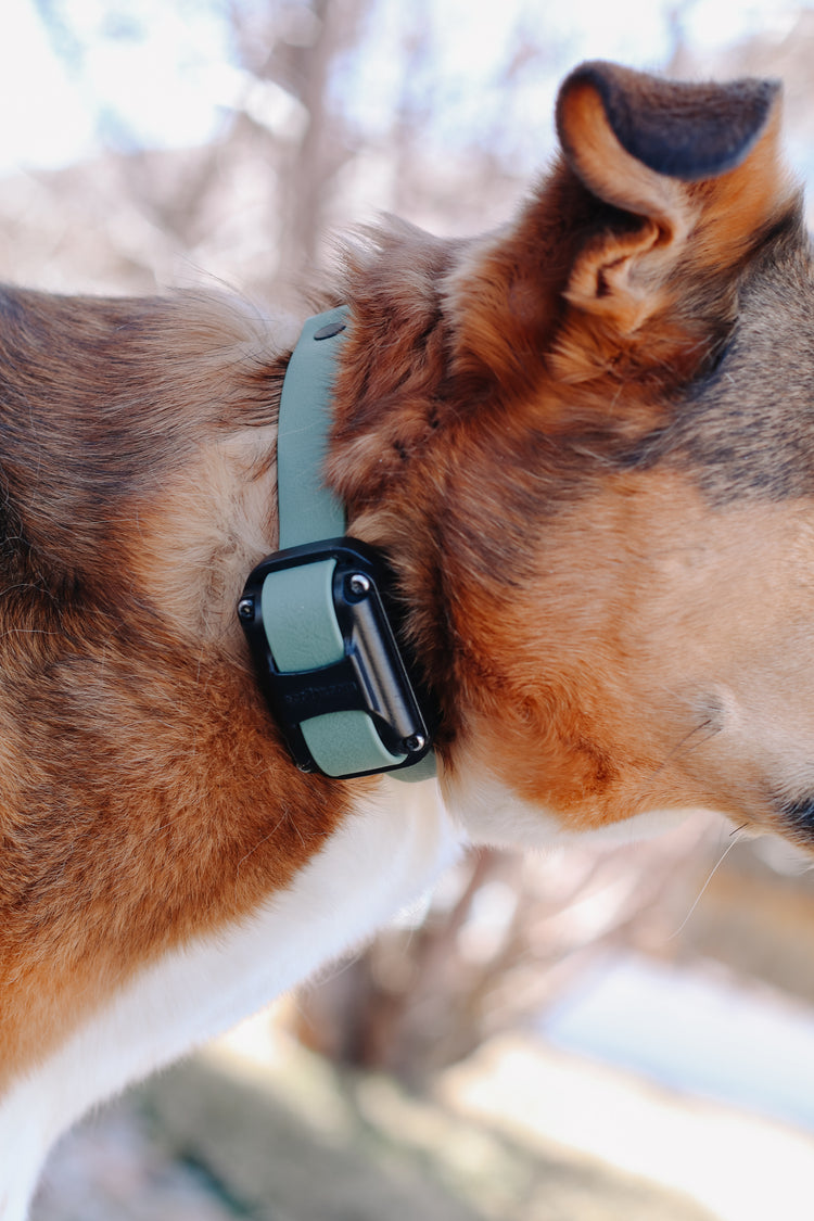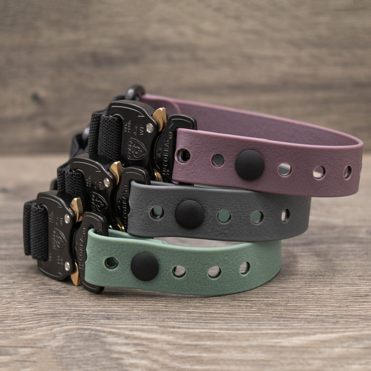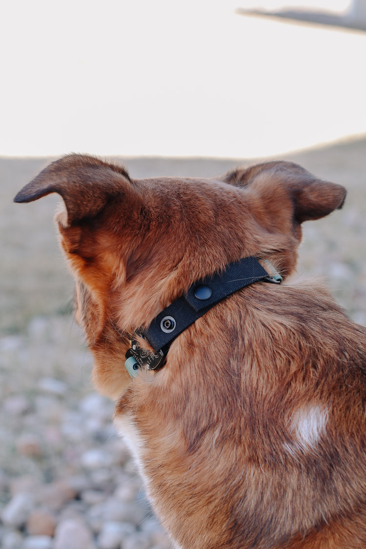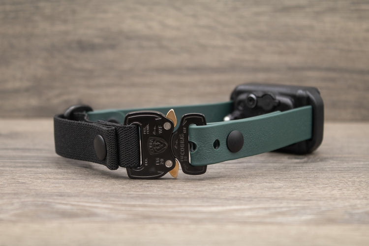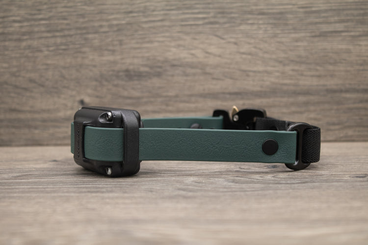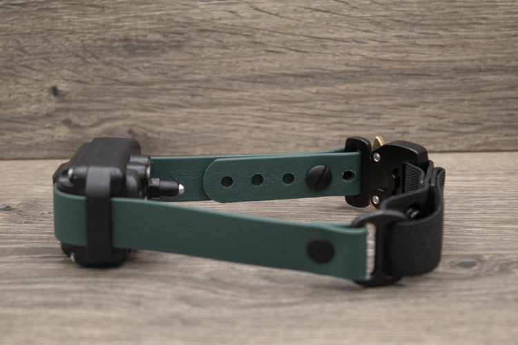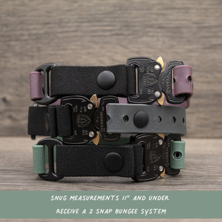 The Everest E Collar Strap, a lightweight, easy to use collar. The bungee system allows for a snug fit. Once you get the holes adjusted to your dogs size you can just buckle it and snap it snug for fast and easy use. All of our collars are made with a custom coated webbing and our very own colors! Although they may look similar to leather, they are made with a durable coated webbing that can withstand the elements. They are waterproof, mold resistant, and low maintenance!