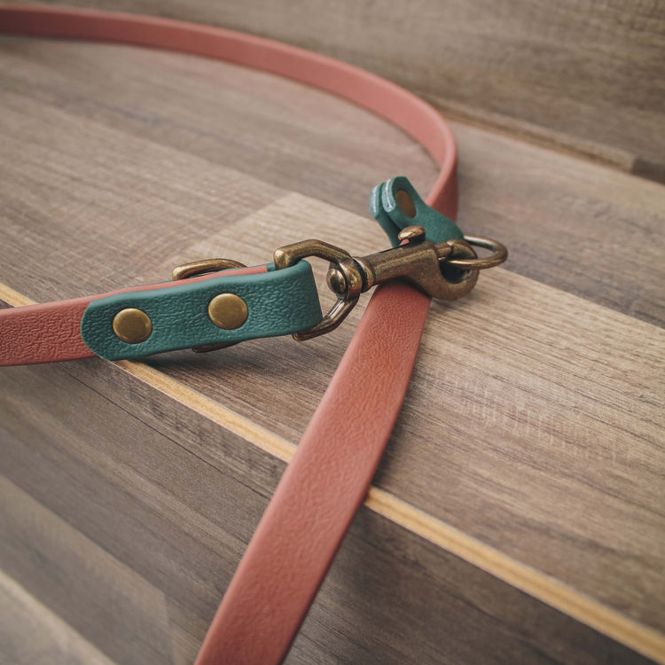 All of our leashes are made with a custom coated webbing and our very own colors! Although they may look similar to leather, they are made with a durable coated webbing that can withstand the elements. They are waterproof, mold resistant, and low maintenance! We use solid brass hardware which is resistant to rust, however brass may patina when exposed to sun + water.