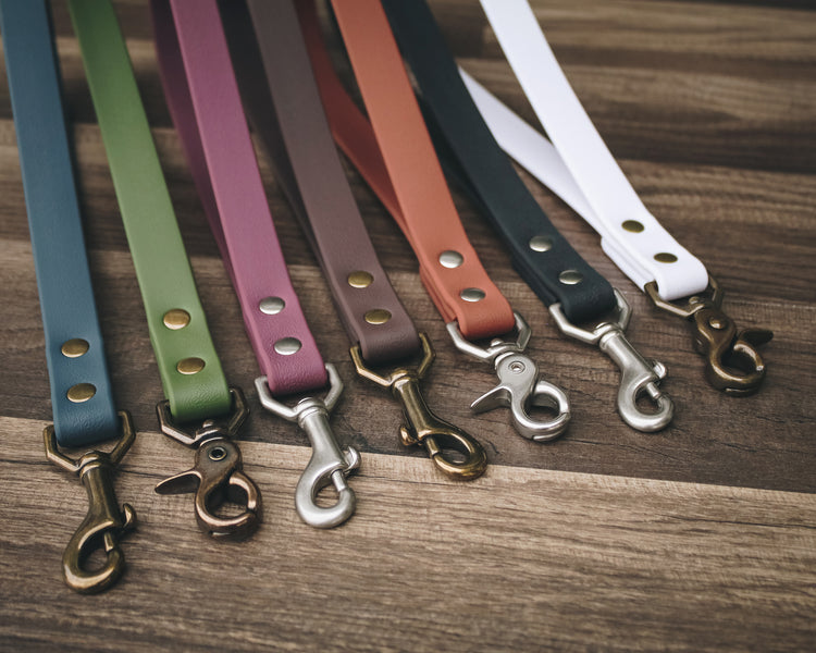 Although they may look similar to leather, they are made with a durable coated webbing that can withstand the elements. They are waterproof, mold resistant, and low maintenance! We use zinc alloy coated buckles and solid brass hardware, both of which are resistant to rust. Brass hardware can patina with use when exposed to water + sun and may rub onto lighter coated coats.