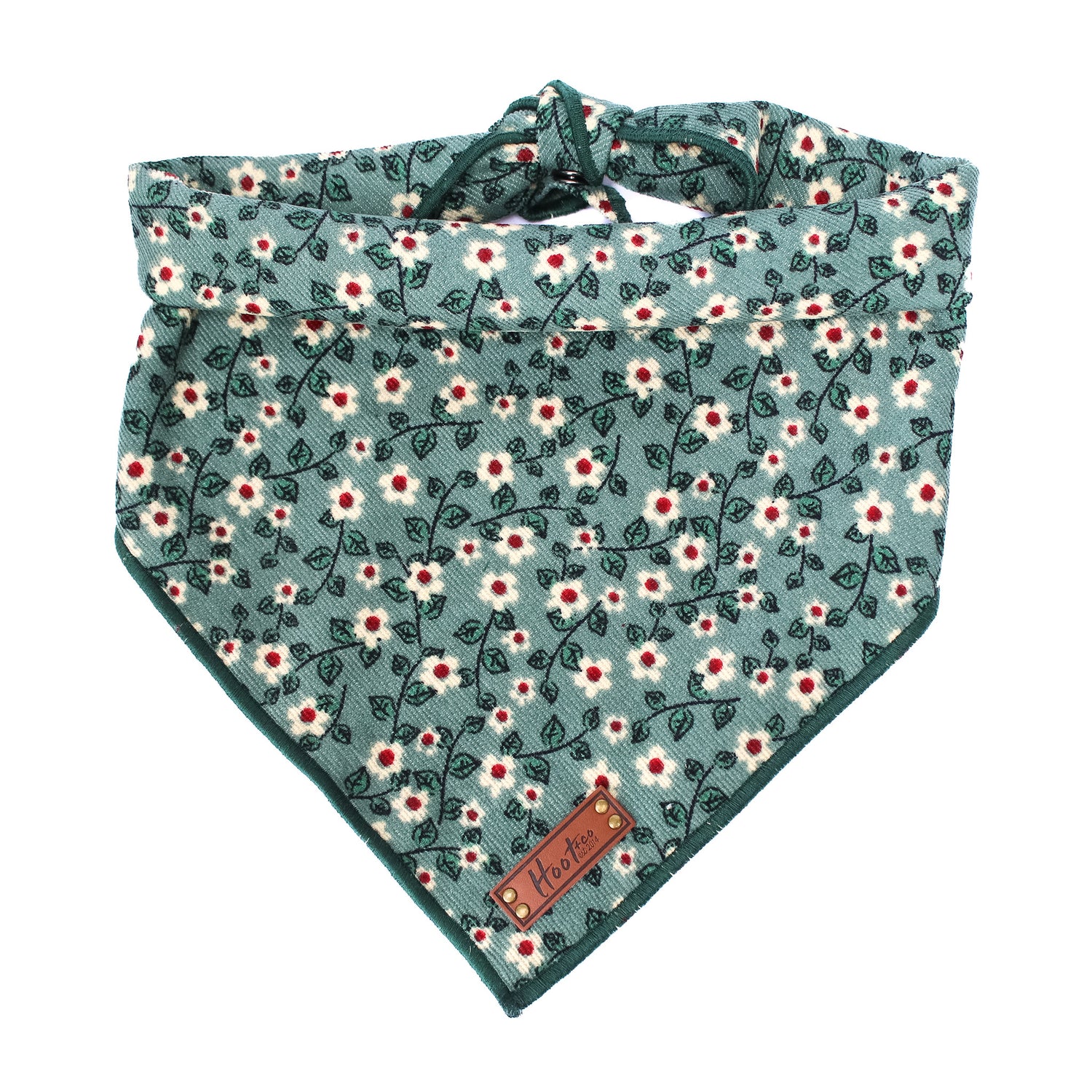 Snap On Bandana - Cotton fabric, a coordinating solid backing and a durable Hoot + Co logo metal snap. Each bandana is hand cut and sewn to fit your animal precisely. Our bandanas feature a curved neck for a comfortable fit that won’t bunch up. All of our bandanas are reversible! Just simply snap them on the other way and you have a solid bandana also, perfect for adding your favorite patch to!